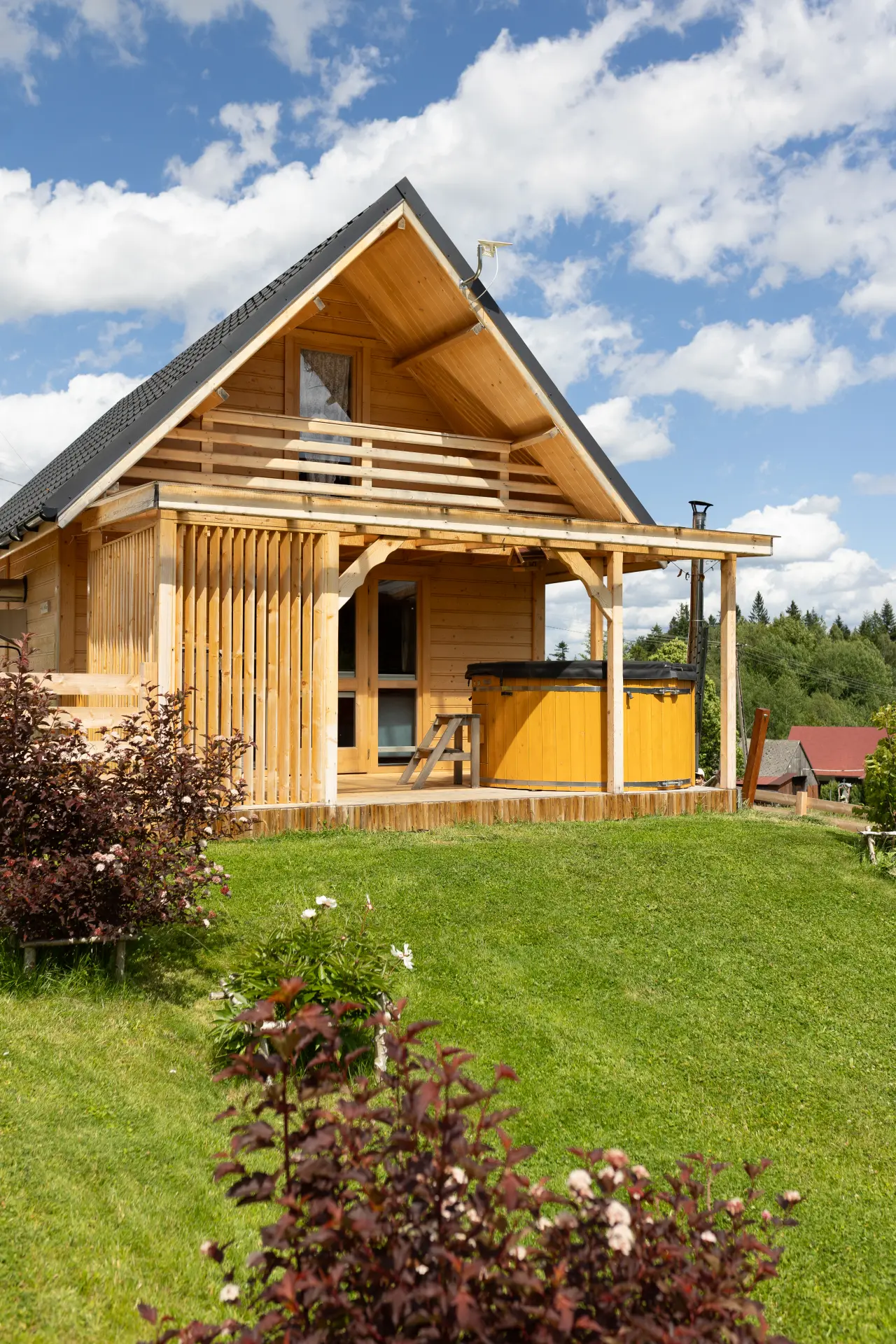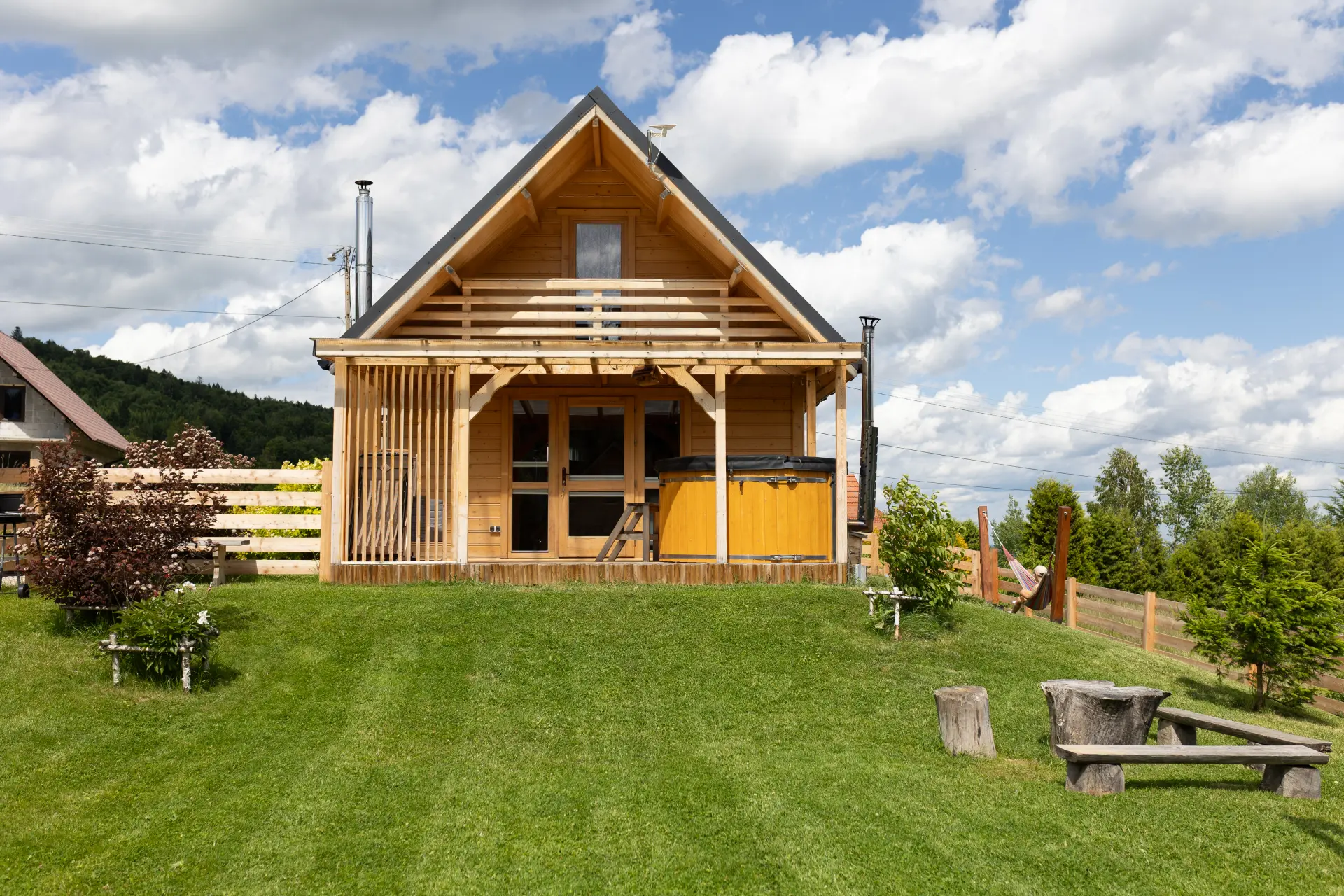 Drewniany domek z jacuzzi i malowniczym widokiem