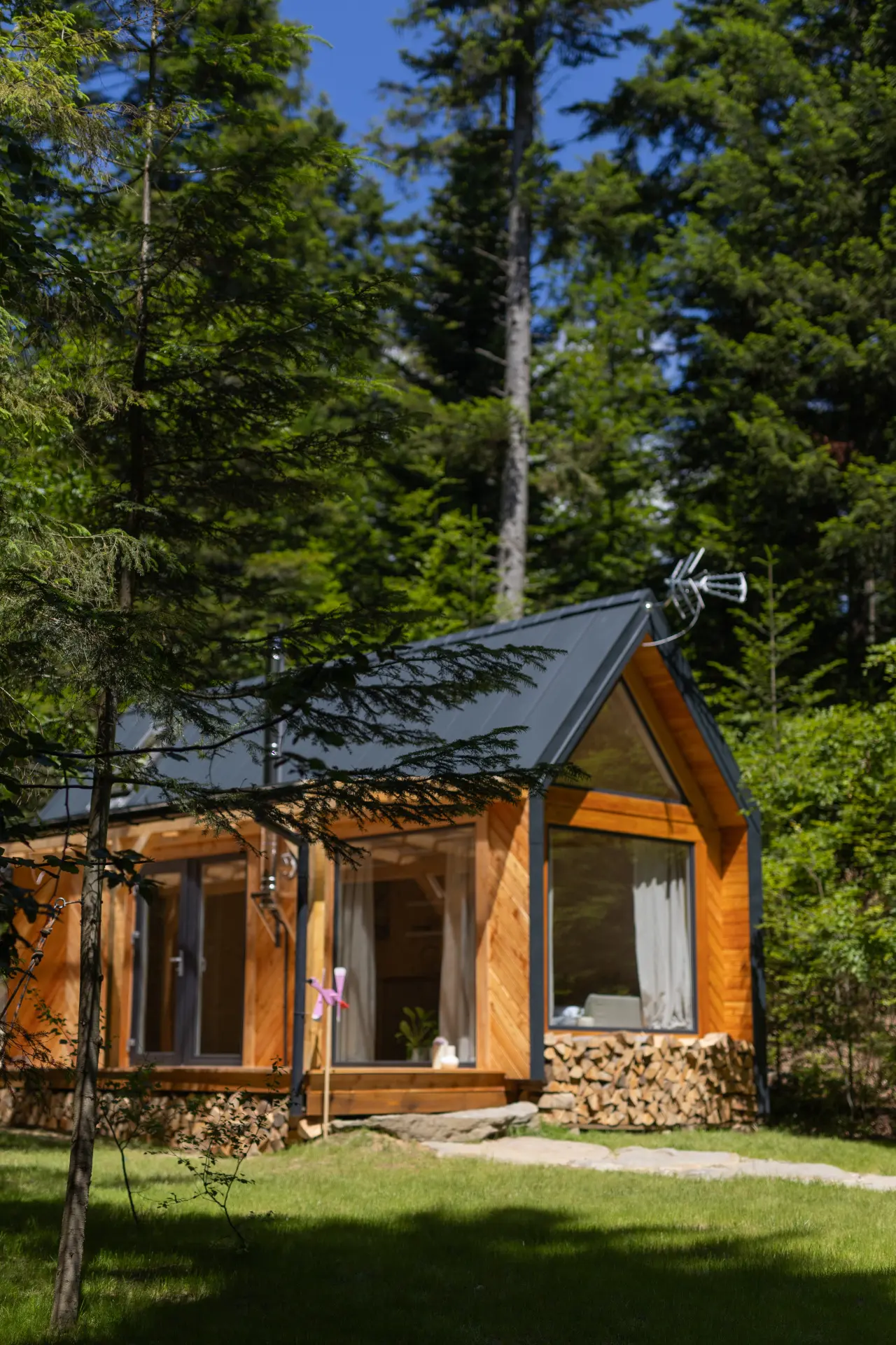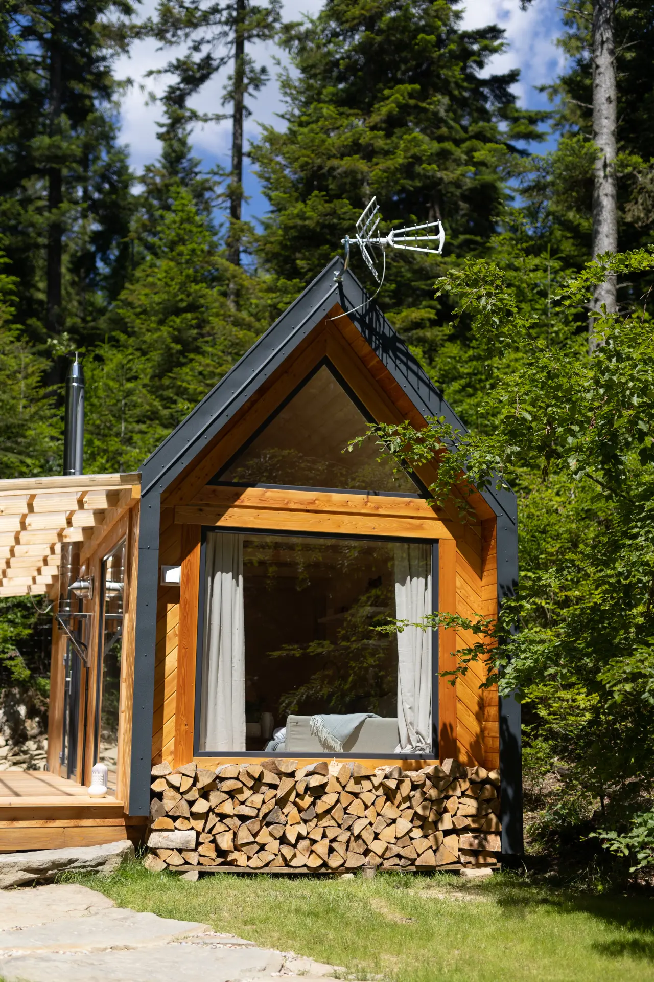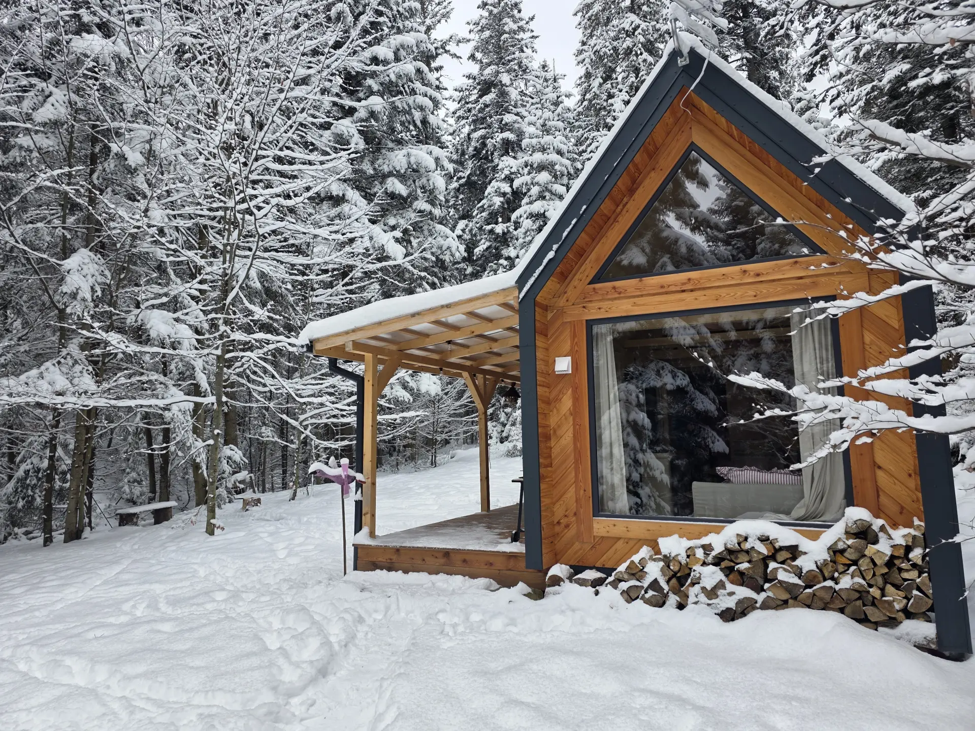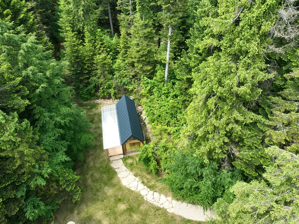 - Łazienka: Oferuje prysznic z zapierającym dech w piersiach widokiem na las (brak pralki).