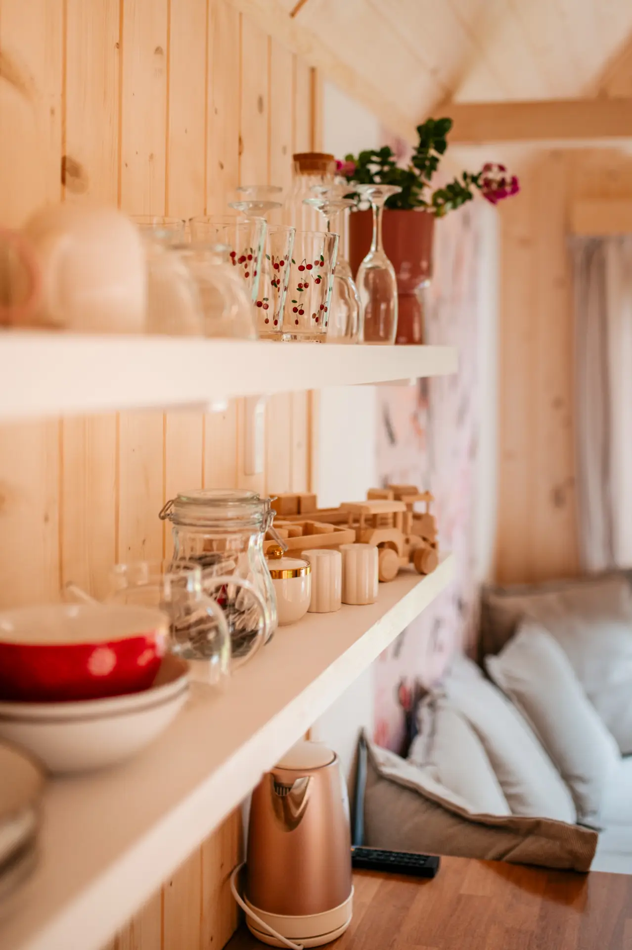 - Salon: Znajdziesz tu rozkładaną sofę, meble kuchenne oraz kominek, które razem tworzą przytulną przestrzeń do relaksu.