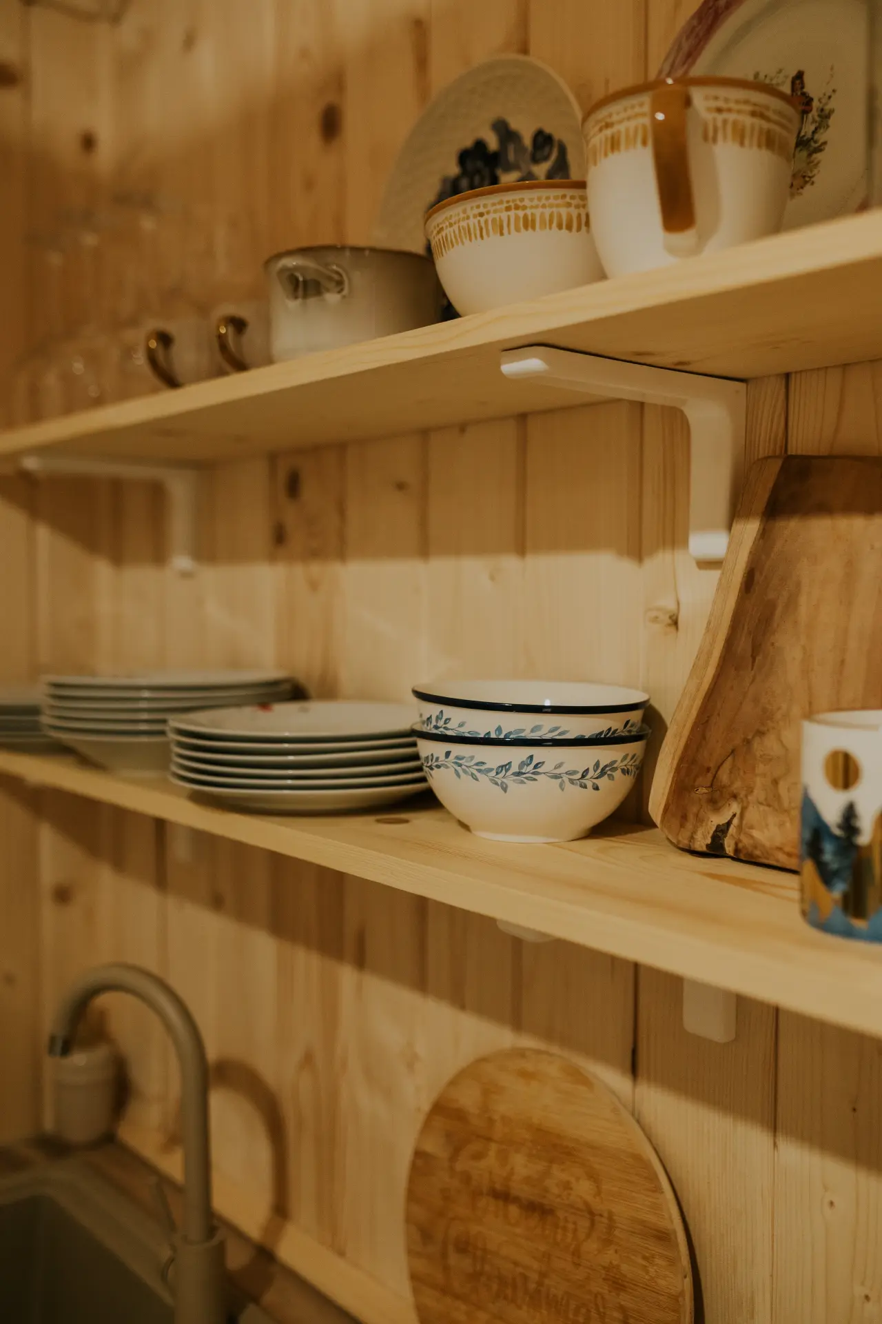 - Mezzanine: an open space with a double mattress – a place created for a peaceful sleep among nature.