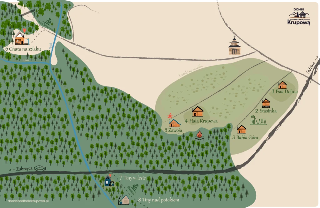 Domki Psia Dolina, Babia Góra, Stasinka, Hala Krupowa oraz Zawoja są położone na naszym „osiedlu”, jednak odległości między nimi są na tyle duże, że zapewniają prywatność podczas pobytu.